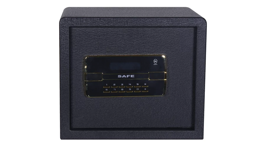 Acél elektronikus bútorszéf, számzárral és biztonsági kulccsal, mely kisebb tárgyak és készpénz biztonságos tárolására alkalmas. A talajhoz vagy a falhoz rögzíthető. A széf belső mérete: 34,6 x 37 x 25 cm