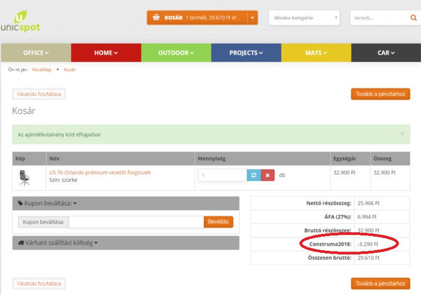 Ekkor megtekinthetjük a kosarunk tartalmát és itt közvetlenül megadhatjuk a matricán lévő kuponkódot.