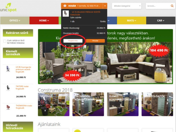 A képernyő felső részén a kosár ablakot megnyitva a PÉNZTÁR gombra kattintva egyenesen a pénztárba jutunk.