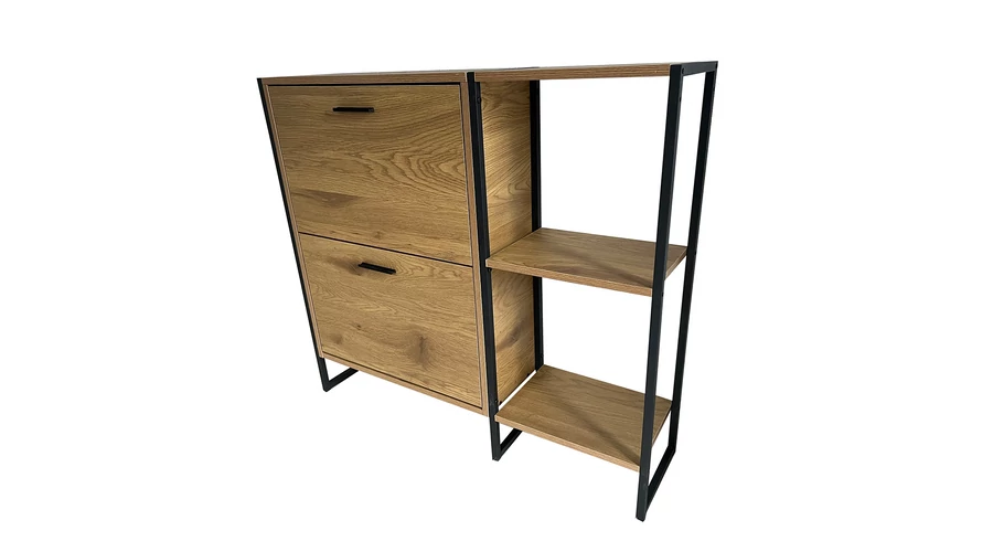 Kis helyigényű, praktikus cipőtároló, elegáns, fekete színű fém kerettel. Kb. 12-16 pár cipő tárolására alkalmas. A polcokon a cipőtisztítás kellékeit vagy egyéb apróbb dolgokat lehet tárolni.
