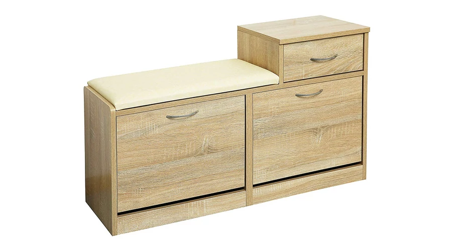 Kis helyigényű, praktikus cipőtároló, elegáns, króm fogantyúval. A kényelmes, bézs színű, műbőr ülőfelület miatt a cipők le- és felvétele még könyebb. Kb. 12 pár cipő tárolására alkalmas. A fiókban a cipőtisztítás kellékeit vagy egyéb apróbb dolgokat lehet tárolni.