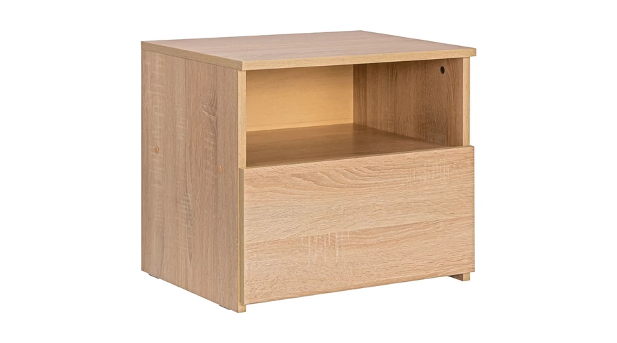 Hagyományos megjelenésű, kihúzható fiókkal és tároló polccal ellátott éjjeli szekrény. Kialakításának köszönhetően masszív, időtálló szerkezet, mely kis helyen elfér. A terméket 1 csomagban, lapra szerelten szállítjuk.