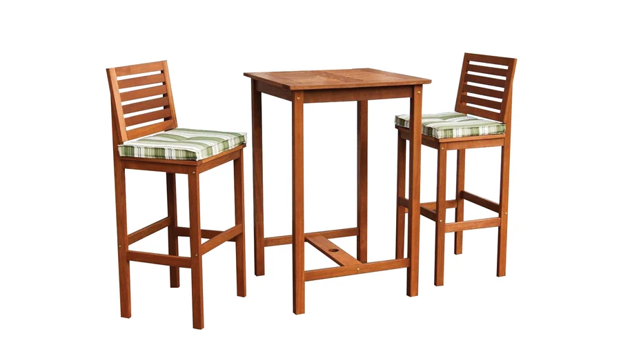 2 személyes kerti bár szett 1db négyszögletes asztallal és 2db magas bárszékkel, valamint párnákkal. Trópusi keményfából készült, ami ellenáll az időjárás viszontagságainak. Mivel kis helyen elfér ezért ideális erkélyekre.