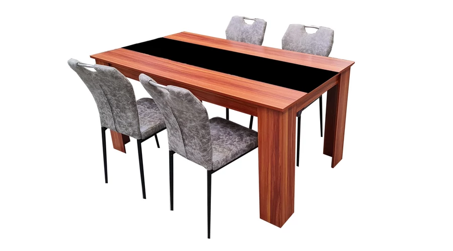Elegáns megjelenésű fa étkező asztal, 5 mm vastag, füst színű, edzett üveg betéttel. 4 db kényelmes, textilbőr borítású, magas háttámlás étkezőszékkel. Irodákba tárgyaló asztalnak is tökéletes megoldás.