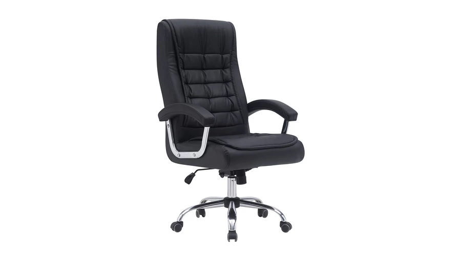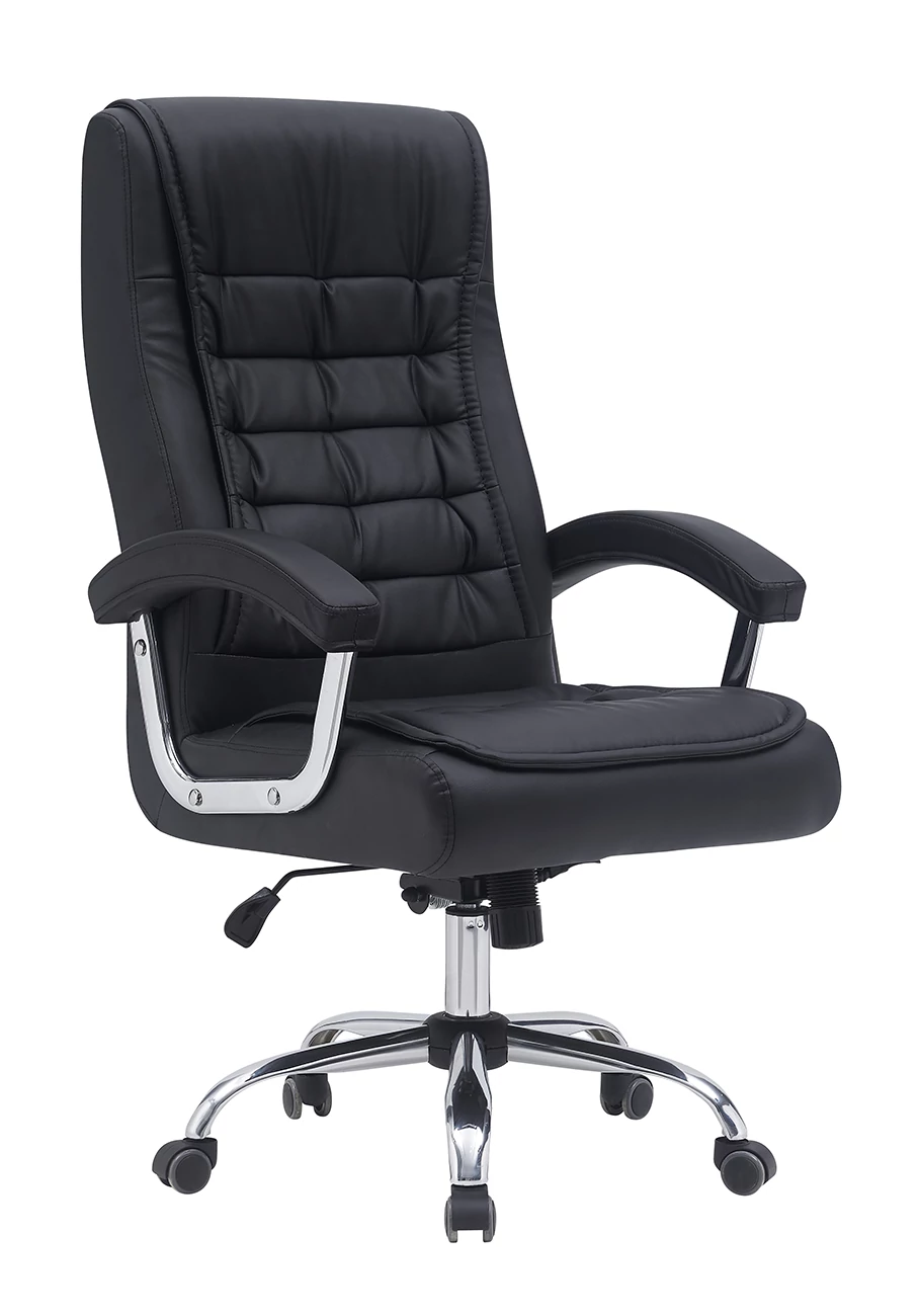 Nagyméretű, karfás, króm fém csillaglábbal ellátott, műbőr kárpitozású irodai forgószék. A hintamechanika, a gázliftes magasság állítás igazán kényelmessé teszik, az akár több órás munkavégzést is. A háttámla ergonomikus kialakítása segít a helyes ülő tartás megtartásában, így óvja a gerincet.