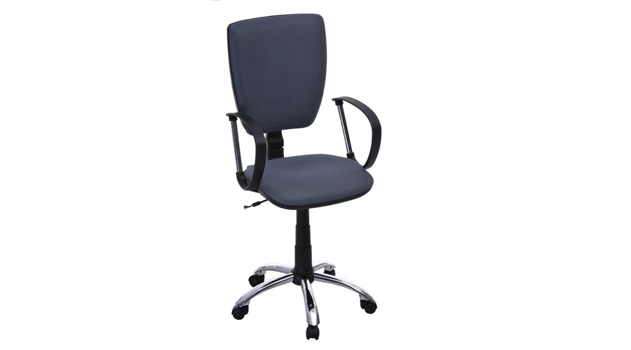 Irodai forgószék, középmagas háttámlával, puha ülőfelülettel, műanyag karfával, textil kárpitozással. Műanyag, görgős csillaglábbal és gázliftes magasság állítással.