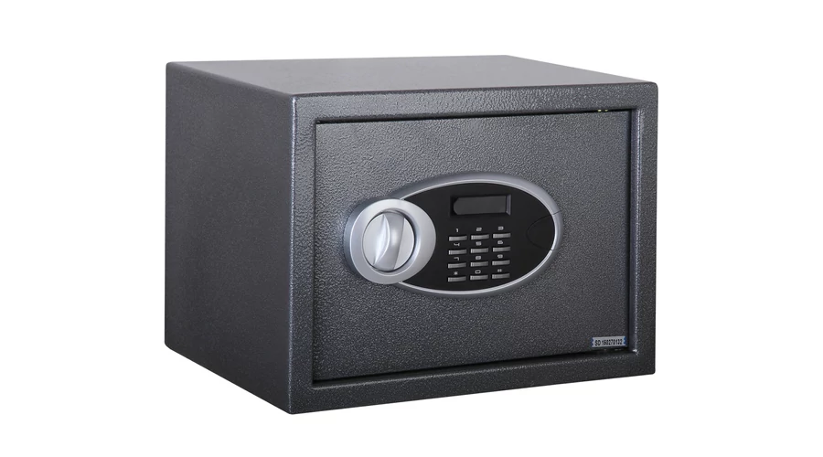 Acél, elektronikus számzáras széf, biztonsági kulccsal, mely kisebb tárgyak és készpénz biztonságos tárolására alkalmas, belső polcos kialakítással. A talajhoz vagy a falhoz rögzíthető. A széf belső méretei (MélyxMagxSzél): 22x22x32 cm.