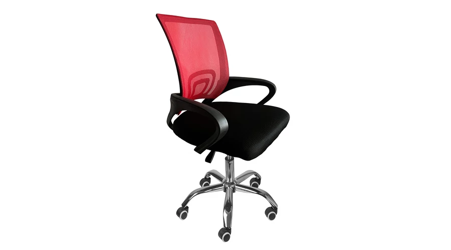 Irodai forgószék, közép magas mesh háttámlával, puha textil kárpitozású ülőfelülettel, műanyag karfával. Műanyag görgős króm csillaglábbal, gázliftes mechanikával.